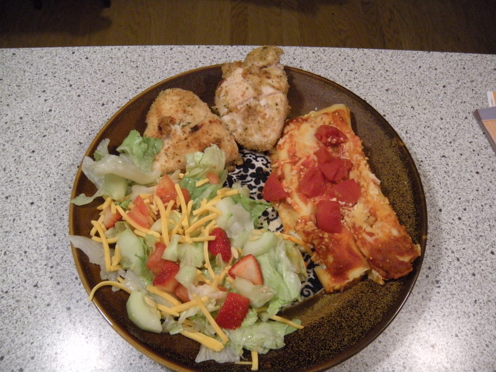This is what I made last night. I swear it looked a lot better in real life, I feel like it looks funny on the plate. I made manicotti, breaded chicken and salad with strawberries, cucumbers, tomatoes, and cheese of course. It tasted really good! I’m very happy with it.